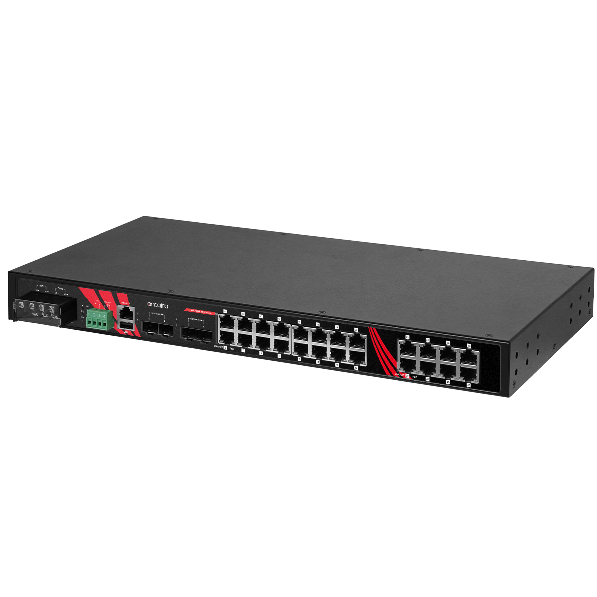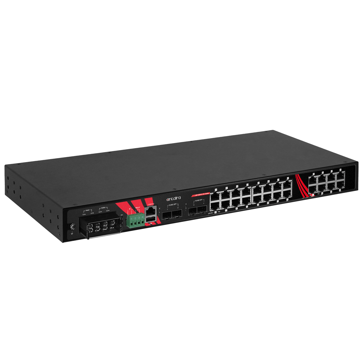 Switch LMP-2804G-4XS-24-T został zaprojektowany w obudowie 1U rack 19” o klasie ochrony IP30. Model ten obsługuje podwójne wejście zasilania o niskim zakresie napięcia (12–55 VDC) oraz posiada wbudowany podbijacz napięcia, umożliwiający dostarczanie pełnej mocy 48 VDC PoE dla dowolnej aplikacji PoE. Obsługa rozszerzonego zakresu temperatur pracy od -40°C do +75°C sprawia, że jest to optymalne rozwiązanie do zastosowań w trudnych i ekstremalnych warunkach środowiskowych, takich jak energetyka i utilities, transport, oczyszczalnie wody i ścieków, przemysł naftowo-gazowy oraz systemy monitoringu i bezpieczeństwa.