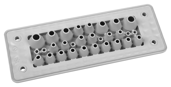 Seria MHF została zaprojektowana z myślą o maksymalnej elastyczności zastosowań. W zależności od modelu przepusty umożliwiają prowadzenie od kilku do nawet ponad stu przewodów lub rurek o różnych średnicach. Konstrukcja membrany oraz rozmieszczenie otworów pozwalają na uzyskanie wysokiej gęstości upakowania przewodów przy jednoczesnym zachowaniu szczelności i stabilności montażowej. Wzmocniona rama wykonana z polipropylenu z dodatkiem włókna szklanego oraz korpus z termoplastycznego elastomeru gwarantują odporność mechaniczną, wytrzymałość na ściskanie i pełną stabilność wymiarową nawet w zmiennych warunkach temperaturowych.